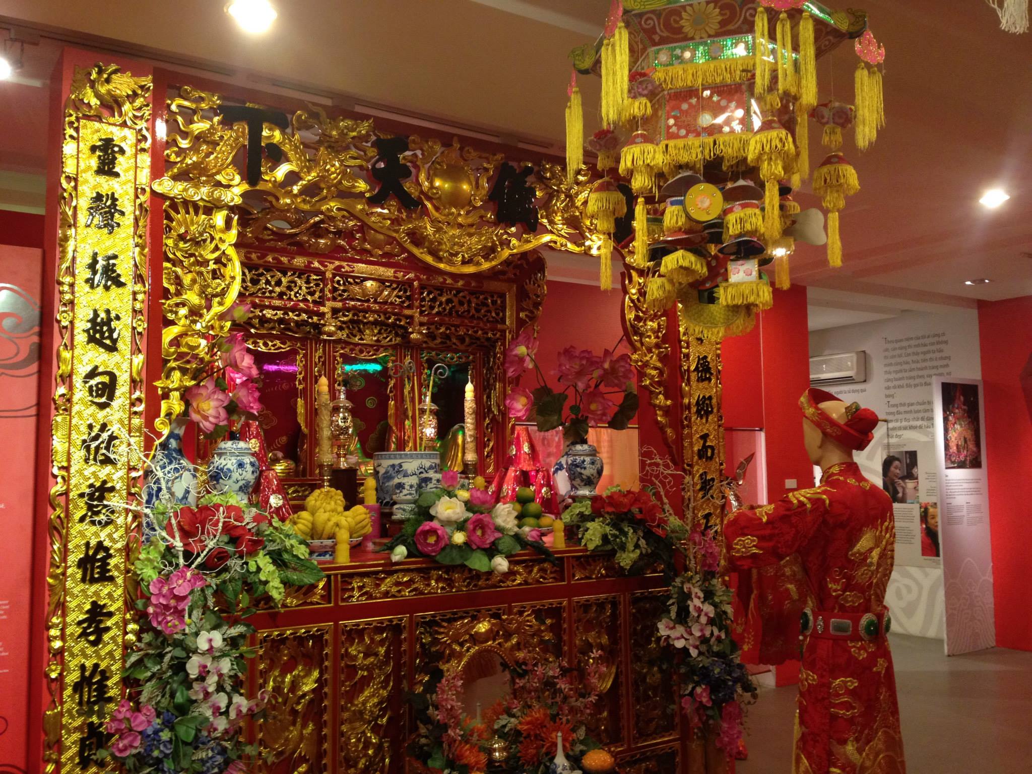 一樓的接待區與紀念品區是迎賓的門面,二至四樓分別以「家庭中的女性」(Women in Family)、「歷史中的女性」(Women in History)與「時尚的女性」(Women’s Fashion)為主題進行展覽。「家庭中的女性」展區(圖2),以女性的生命歷程,展出越南的民族服裝、婚嫁禮服,以至關於婦女的禮俗與婚後生兒育女、照顧家庭的情況。透過這個展區,顯現了越南多民族的特質,其中以京族(或稱越族)為大宗,其他依照語系、語族、文化的不同,目前被區分為54族。由服裝的特色來看,多為長袖上衣或長擺上衣搭配襦裙或衫褲,並束上腰帶;依照族群的不同或場合的差異,搭配頭巾、圓盤頭飾或斗笠。除了婚嫁時的禮服外,庶民的日常服飾在色彩表現上多以黑色為底,接上紅色布料和彩色的線條,顯現低調、樸素中又帶有活潑、熱情的風格。而在婚慶習俗的展現上,包括祭祀儀式、宗教信仰、祖先崇拜等桌櫃、器物的陳列,可看出越南深受古代中國文化之影響(圖3)。