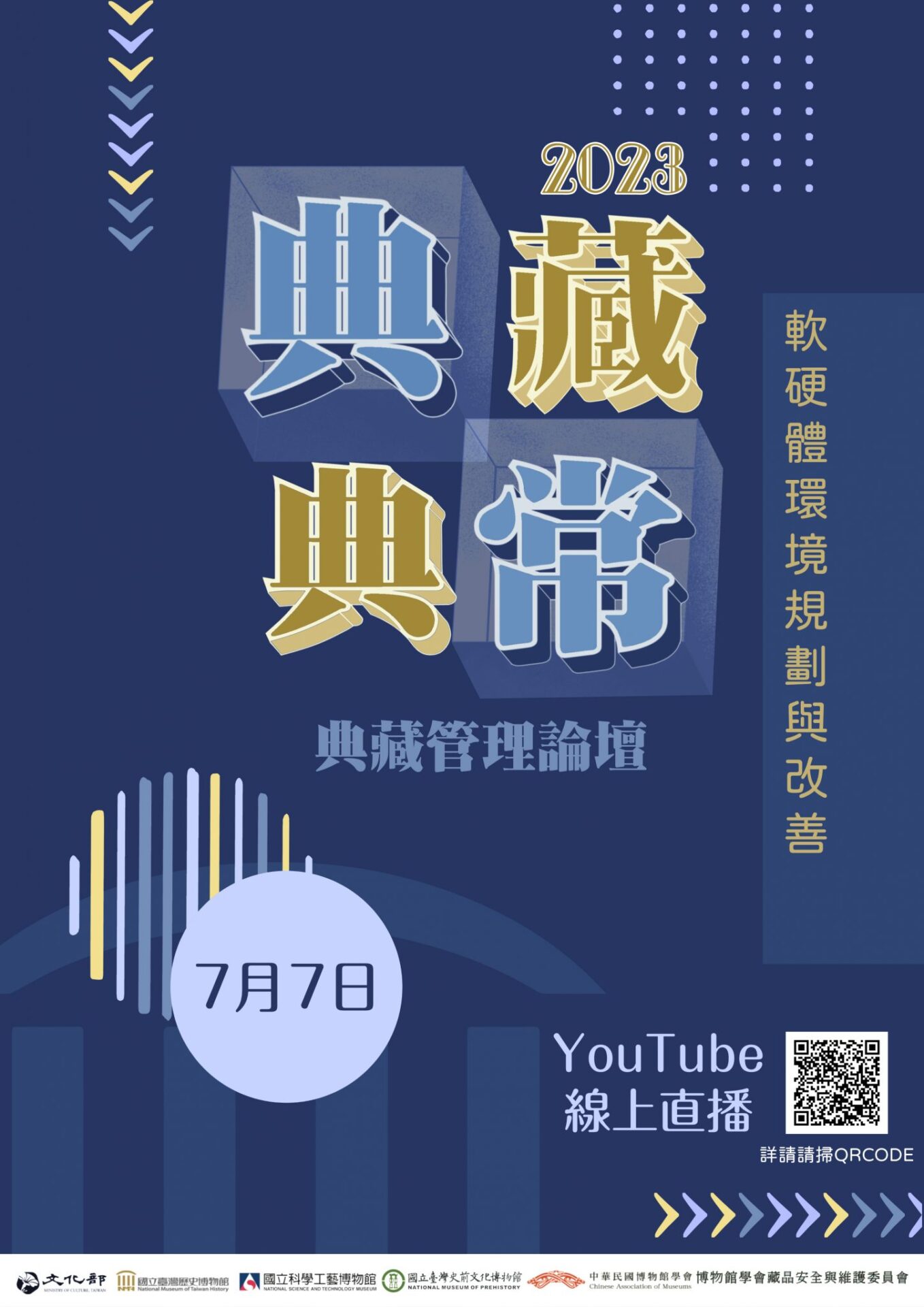 「典藏・典常」典藏管理論壇自2021年起舉辦,今年為第三屆,以「軟硬體環境規劃與改善」為主題,由國立臺灣歷史博物館(以下簡稱臺史博)、 國立科學工藝博物館(以下簡稱科工館)、國立臺灣史前文化博物館(以下簡稱史前館)、 中華民國博物館學會共同合辦,且以線上直播的方式,擴及更多博物館工作者。延續往年以博物館典藏管理和保存維護工作人員實務經驗出發,擴大典藏相關業務的討論,並提出問題與解決方案,促進館際之間實務和理論上的交流。