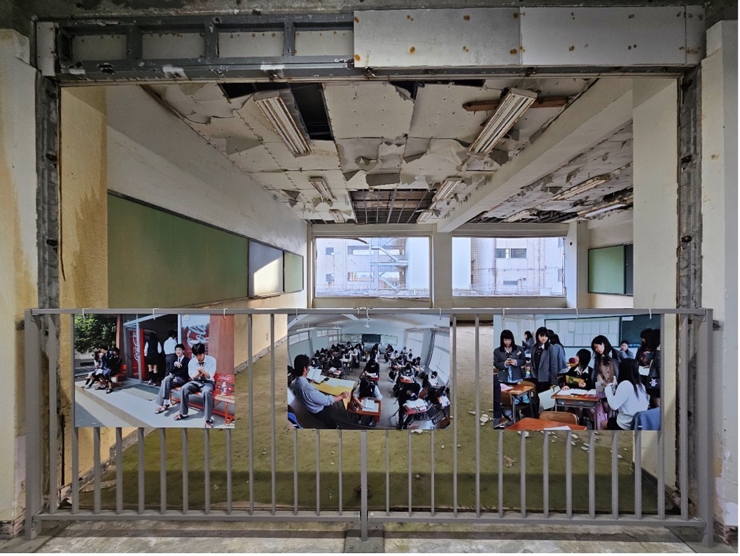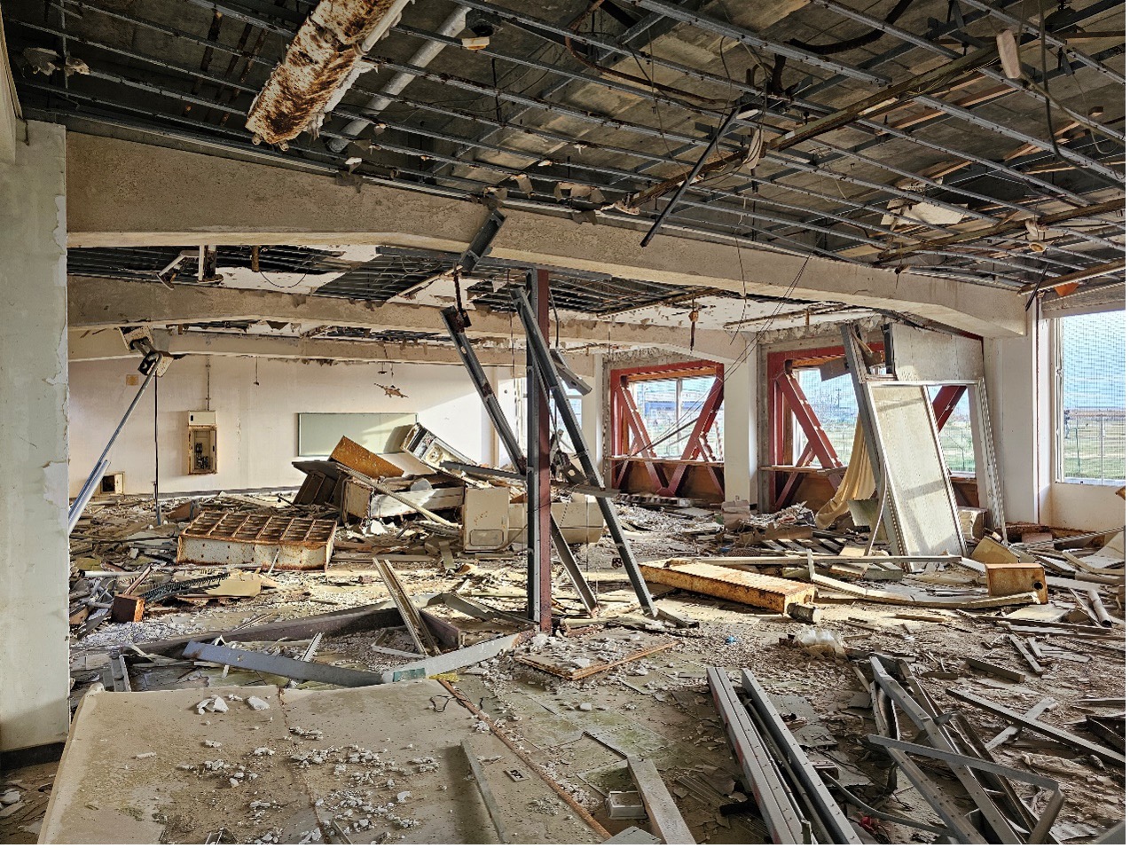 第二展區「震災遺址」完整保存了「向洋高中校舍」被海嘯襲擊後的遺構。觀眾穿過散落滿地的課本、書櫃、桌椅,自一樓拾級而上,經過三樓「海嘯沖來的車輛」、四樓「海嘯到達處」,抵達頂樓的「最終避難處」。寧靜的遺構空間裡,殘破不堪、人去樓空的教室宛如海嘯留下的疤痕,與牆上充滿活力的青春校園照片形成強烈對比。