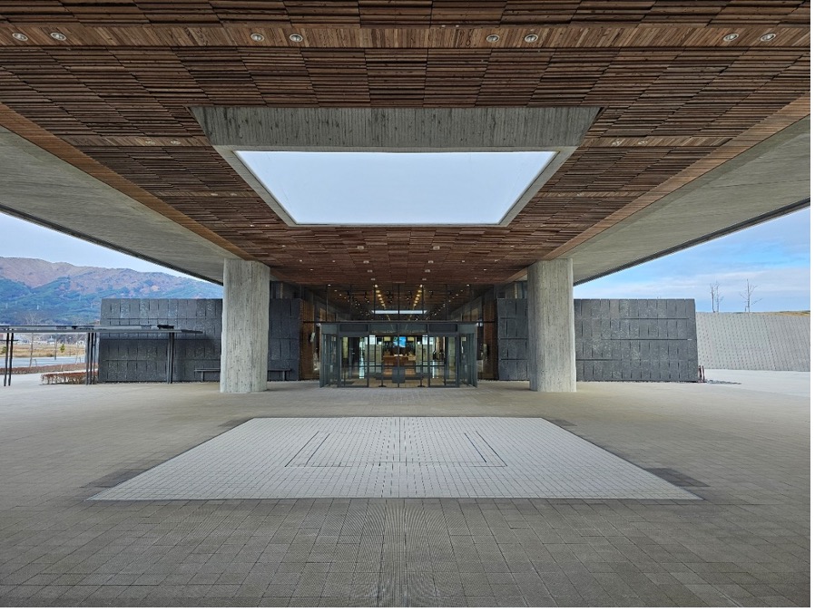 岩手海嘯紀念館坐落於「高田松原海嘯復興祈念公園」內,入口以中軸對稱的空間設計呈現強烈的紀念氛圍。參觀完館內展示後可前往戶外園區,經過通往海岸的中軸道路,便會抵達供民眾獻花致意的「追悼廣場」。紀念館周圍還有許多重要的地標與象徵,包括象徵堅毅精神的「奇蹟一棵松」、保存遺構的「氣仙中學」以及災後復育松樹的「防潮林」。