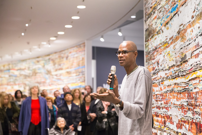 藝術家Mark Bradford在Hirshhorn向觀眾分享他的個展創作。 拍攝者:Erin Schaff,由 Hirshhorn提供。