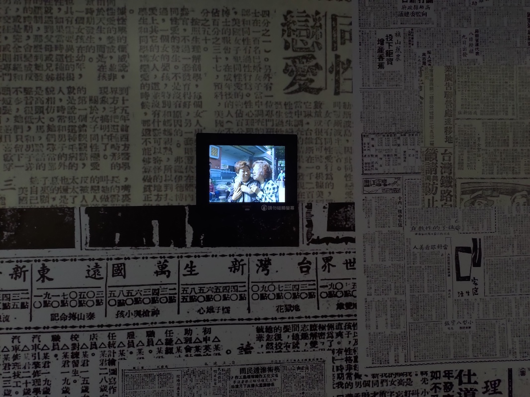 後方展牆上,除了以文字與家庭相簿展示導演對母親成長經歷的理解,還將過往同志相關的媒體報導以大圖輸出佈滿整個牆面,反映出同志族群不被理解的困境,或是他們在當年的處世之道。策展團隊也以小型螢幕播放紀錄片中母親與女友的親暱相處,在報紙資訊的烘托之下,兩人的身影彷彿成為某種時代的見證,她們幸福的神情似乎也暗示著壓抑的過往已逐漸結束。