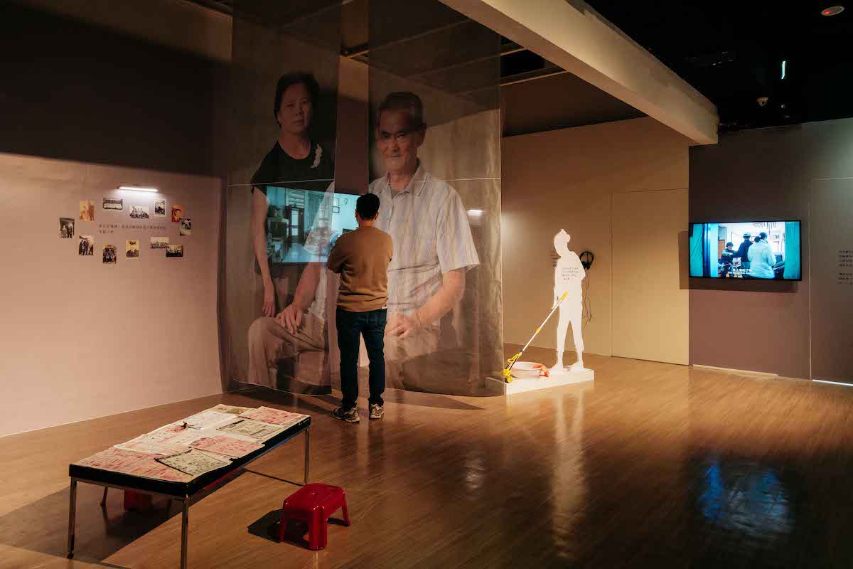 展間後半部裝設多個小螢幕,播映片中導演訪談不同人物的家族故事,包含外省移民無法復返的青春回憶,或是戒嚴時期異議人士的夾縫生存,另一側則播放學生對各自家庭的回溯。觀眾可跳脫導演剪輯的敘事邏輯,自行選擇觀看順序,使這部「群像」紀錄片在每位觀眾中留下不同的面貌。展覽藉由裝置手法,使珍貴的訪談內容躍出電影螢幕,可惜分散且片段式的影像裝置卻容易讓片中人物成為歷史圖例,造成觀眾失去觀看的焦點。若能聚焦片中某些片段,並依據此延伸出有別於紀錄片的內容,便能給觀眾帶來更深刻的觀展體驗,但這或許也是展覽在內容轉譯與貼近原初文本之間的兩難。