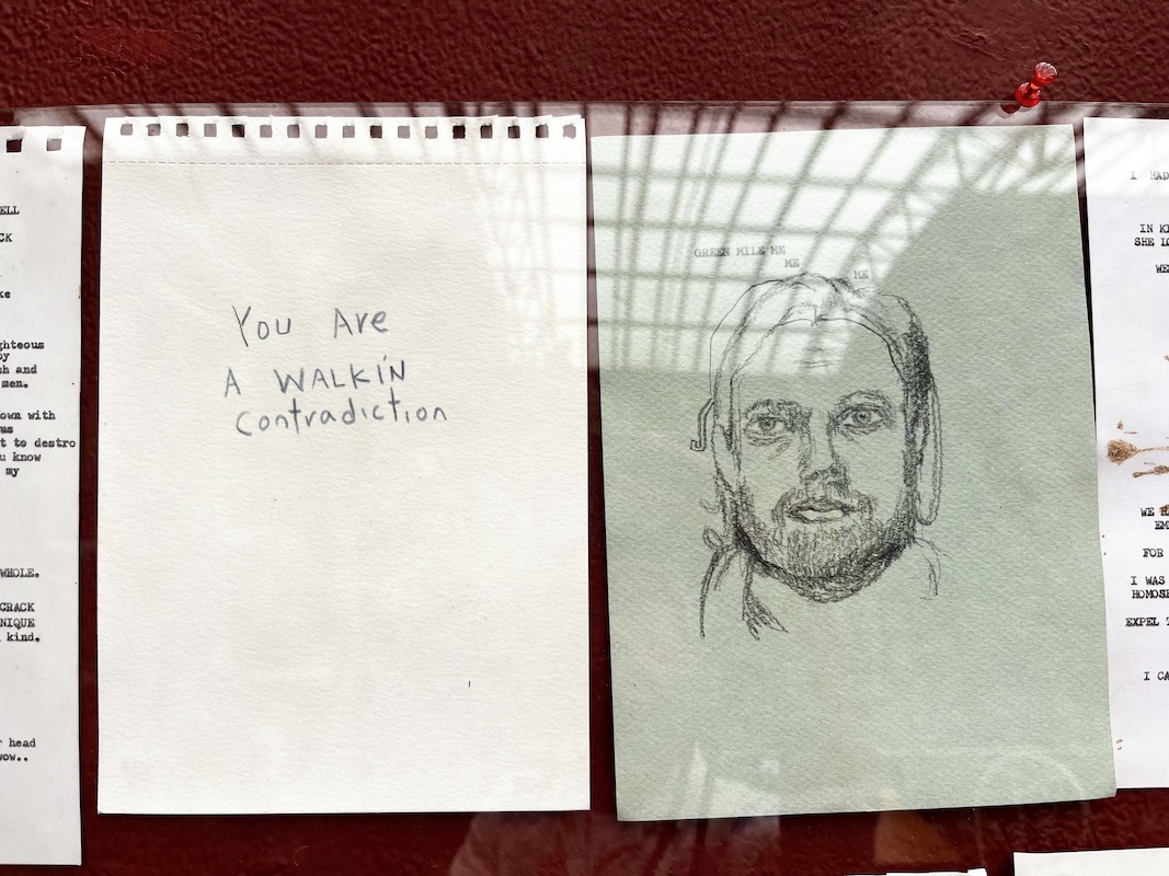 而在展覽中的一角,卡瓦揚將自畫像和一張寫有「你是個行走的矛盾」的作品擺在一塊,得以窺見卡瓦揚在日常生活中所糾結的矛盾,似乎也讓我們理解他渴望透過創作對話的心情。他在作品中揭露,作為菲律賓與德國人共同生下的孩子,縱使他從小就在碧瑤長大,面貌如同白人的他卻時常難以定位自己。此外,他的父親是享譽國際的奇拉・塔西米克,他同樣作為藝術家又該如何思考與父親之間的關係。再者,他身為非原住民,深受原住民族文化啟發的他,又可以怎麼樣理解創作和原住民族還有菲律賓社會的關係。