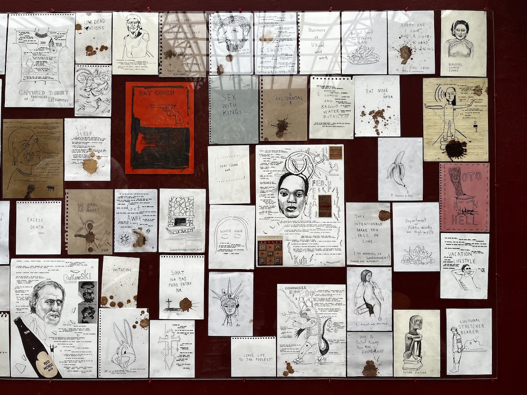 協同策展的藝術家飛兒・奧拉約(Faye Olayo)向我表示,卡瓦揚所有創作的手紙都沒有標註日期,也並非按照特定的邏輯擺放。因此,他們在策展過程中逐一檢視這些創作,並直覺地將相關的作品擺放在一塊,藉此重新思考「檔案」的概念:策展的建檔與分類過程並非使用線性時間回溯過去,而是反映藝術家和協同策展者當下如何定義卡瓦揚的心路歷程。