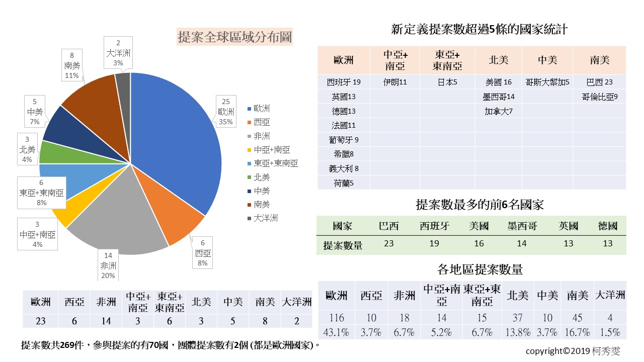 我們把全球劃分成9個區塊:歐洲、西亞、非洲、中亞+南亞、東亞+東南亞、北美、中美、南美與大洋洲等區塊,分別統計參與公開提案的數量分布情形。統計結果顯示:
