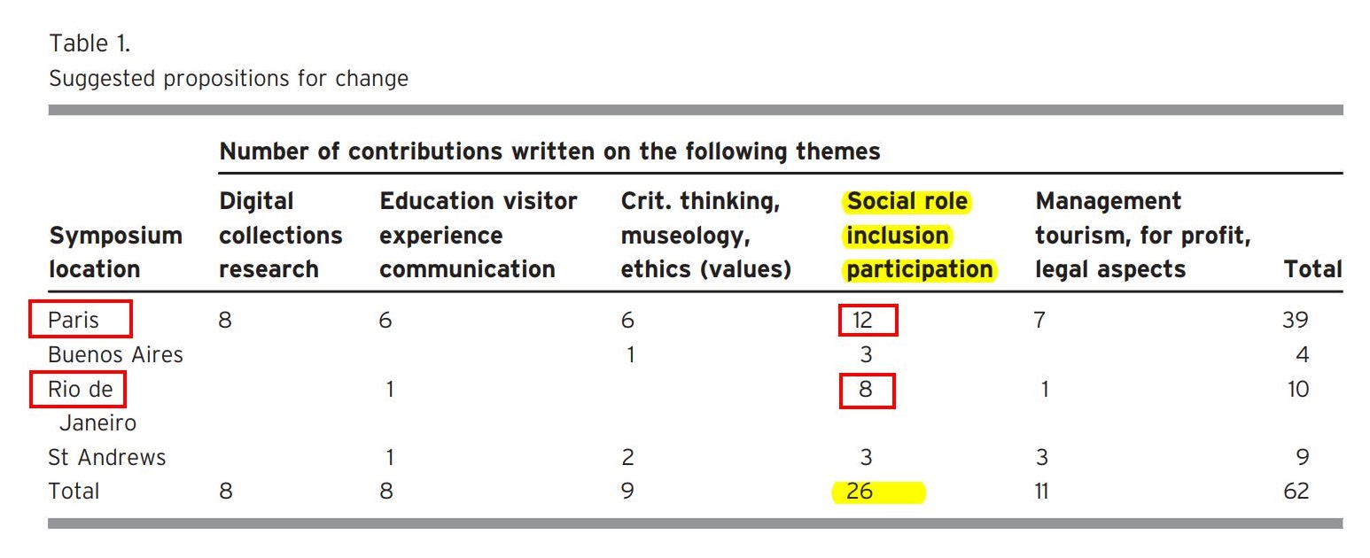 那麼,MDPP的新定義主張,是否真的如媒體報導所言「由內部自己擬定」?ICOFOM在2017年發起了博物館定義的學術辯論,並邀請博物館學家、專業人士和決策者參加在世界各地舉行的一系列座談會。他們蒐集500人參加、共有60多份書面文稿和座談會綜合報告的資料,進行5大類別的分類與分析。結果發現,社會角色(social role)∕共融(inclusion)∕參與(participation)是資料裡頭數量最多的,而且巴黎與里約的座談會比重最高。這份報告由Brown與Mairesse在2018年提出,看來MDPP的新定義主張,並非完全是內部自己擬定,還是有參照依據。同時我們也可以看到,積極參與專業座談會,仍以歐洲與南美博物館人行動力最強;換句話說,整個博物館定義的話語權與主導權,還是以歐美視野為主。