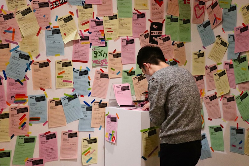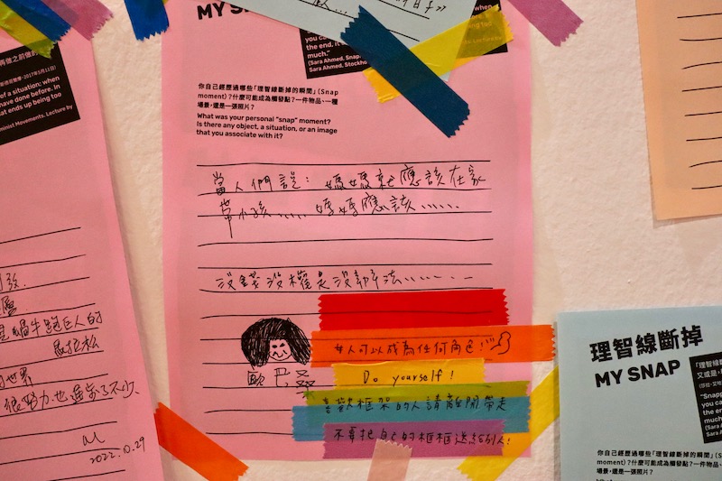 留言區「理智線斷掉的瞬間」更藉由紙膠帶可輕易黏貼的媒材特質,增加觀眾對多元性別和社會身分的探討與支持。例如:某位女性留言抒發家庭與社會對「母親角色」的壓迫,怒吼之外,多位觀眾以紙膠帶留言、拼貼成繽紛的鼓勵,彷彿眾人對留言者一言一句的暖心打氣。
