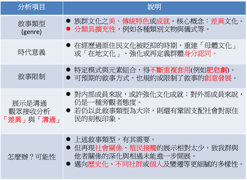 傳統原住民文化展示的歷史非常悠久,要如何提出新問題?國立臺灣史前文化博物館展示教育組的盧梅芬研究員首先針對傳統原住民文化展示提出反省,表示此類展示議題大多強調重建「母體文化」或「在地文化」,且時常運用特定組合與元素來呈現族群的文化特色或成就。這樣的敘事方式不僅強化社會對原住民族群的刻板印象,更限制了展示的創意發展。若要有所突破,建議敘事手法可以邁向歷史化,從不同族群或個人的歷史變遷等更細膩的面向切入。
