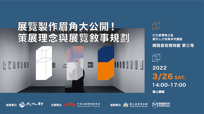 中華民國博物館學會經營之「文化部博物之島國內外資訊專區」策劃「網路書寫博物館—文化部博物之島寫作人才培育系列講座」。延續本工作坊的目的,本次(第三場)講座旨在了解展覽如何製作以及展文書寫分析。因此,2022年3月26日於線上舉行「展覽製作眉角大公開!策展理念與展覽敘事規劃」,由陳佳利教授主持,邀請林怡萱、盧梅芬擔任主題演講嘉賓,以及趙欣怡、城菁汝擔任綜合座談分享人,一同分享豐富的策展思維與展覽規劃經驗。