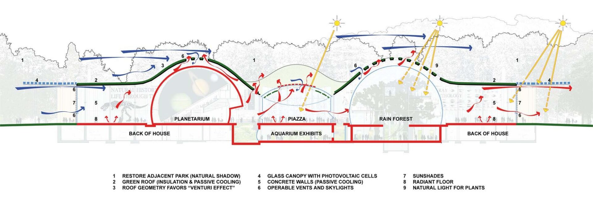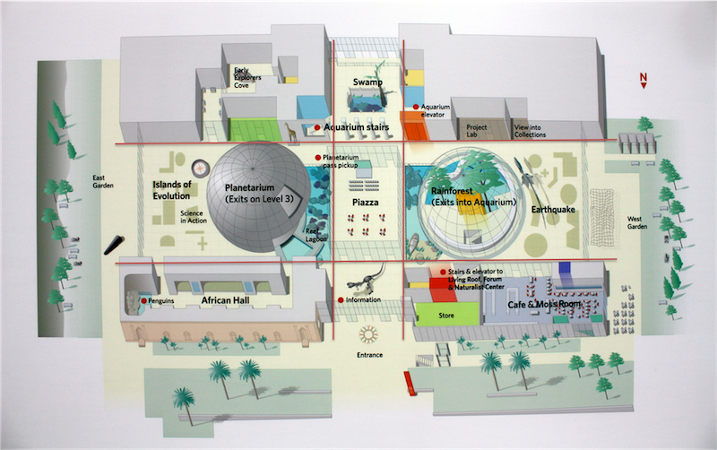 CAS那張綠色屋頂下覆蓋三個館舍:Kimball自然史博物館(Kimball Natural History Museum)、Morrison球幕星象館(Morrison Planetarium)〔註2〕和Steinhart水族館(Steinhart Aquarium),其空間配置在「三進九宮格」式的區劃裏,展現理想博物館建築的幾項特性:(1)空間組織力求簡明易辨;(2)避免博物館疲勞症狀;(3)展示空間力求彈性;(4)充份的展示、利用額外的空間;(5)裡外雅俗共賞〔註3〕。