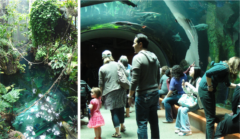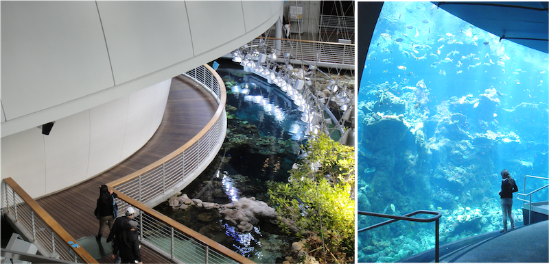 由中庭往右可走入透明、結合自然光與人造光的「熱帶雨林」半球形溫室;往左可依場次進入密閉、綠色工法建造而成的Morrison球幕星象館。這兩個半球像鎮館神山一般提供最真實的沈浸式體驗,而兩個半球外側各設一個常設主題展,分別是與加州地區息息相關的「演化」和「地震」議題。同樣位於第二進的Steinhart水族館是元老級設施〔註5〕,幾近完全地下化。地面層兩球之間的生態池實與地下層水族館的大型海水槽池相通。水族館有透明拱形道,穿越熱帶雨林底部淡水生態池,可仰觀群魚悠游。地下層的大槽池仍可獲得由屋頂瀉下的自然光,可節省大量能源,再次體現綠建築的精神。
