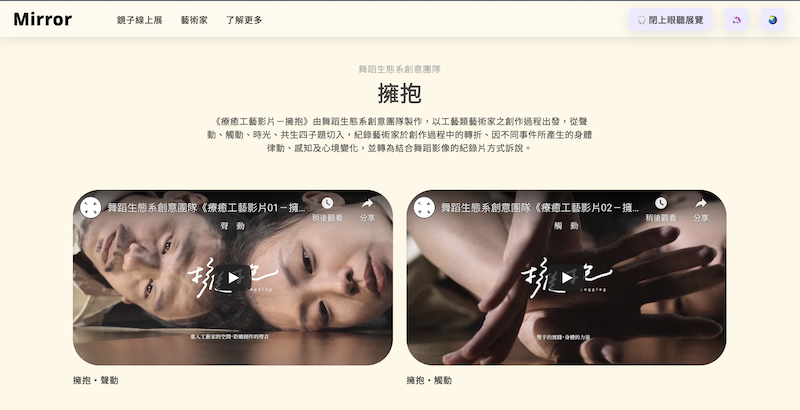 《鏡子》線上展將工藝作品的文字、圖像、聲音及影片等資訊進行網頁展示,並以視障觀眾需求為出發,強調聽覺訊息傳達作品理念,達到線上展覽多元感官互動效果。進而打破以往工藝展覽形式,作為取消實體的策展實驗案例,除了成為強化數位策展的線上互動設計示範,展覽規畫前期導入視障者口述影像語音之「共融策展」(inclusive curating)思維,以及邀請視障者參與內容製作經驗,更是值得作為後疫情時代或未來數位展覽之文化平權實踐參照。