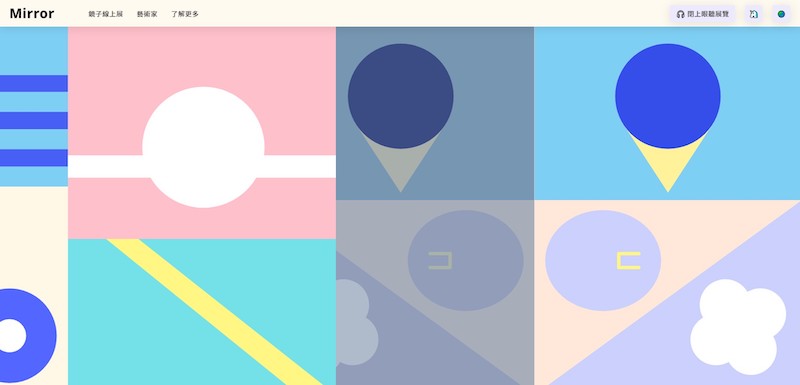 在線上展專網設計上,入口頁面則是強化視覺效果的色塊動態,以內嵌展覽介紹影片,讓觀眾以影音瞭解展覽概念。網站架構上,策展單位選擇以簡化的操作形式,將策展資訊、藝術家、延伸活動,三大項內容設定在頁面左上角。進入每位藝術家的作品頁面,都以動態影像或互動設計導入藝術家作品理念,運用色彩、線條、形狀、律動、對稱、速度、漸層、時間性等元素連結作品意象,以視覺特色引發觀眾興趣,進而深入理解藝術家作品內容與想法,藉以增加觀眾在線上觀展經驗中的好奇心與想像力。