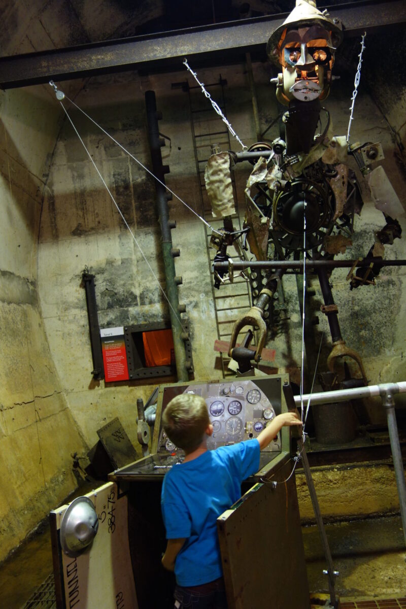 Regarding “Darwin oil storage tunnels”, as a memorial museum being regularly opened to the public, the most special feature is how it connects the emotion between the space and visitors, reminding us the experiences of the war and educating the public. The oil storage tunnels and pipelines were constructed fully underground to protect the fuel supply around Darwin in World War II because the standard oil storage tanks would be easily targeted and destroyed. Now, the long tunnels are used as entrance for visitors, and the first work at the corner is a touchable and a completely human-formed robot named “The Digger” which was made up by remaining pieces and debris of tunnels, symbolizing the soldiers, who carried all the burden, sacrificed themselves with broken bodies in the war. After visitors make a turn at the corner, there is a large-scale tunnel as the main exhibition area which is the only dry and still workable space. It displays the description and pictures of historic incidents and photos of remaining tunnels and items left in wars shot by photographers in the deserts and jungles in the northern territory of Australia. Although this exhibition area is not grandeur or has abundant processions as museums do, it creates the style based on the history of war and idea of contemporary artists. Moreover, it has visitors feel turning back time with old radios playing past broadcast recordings of that time.