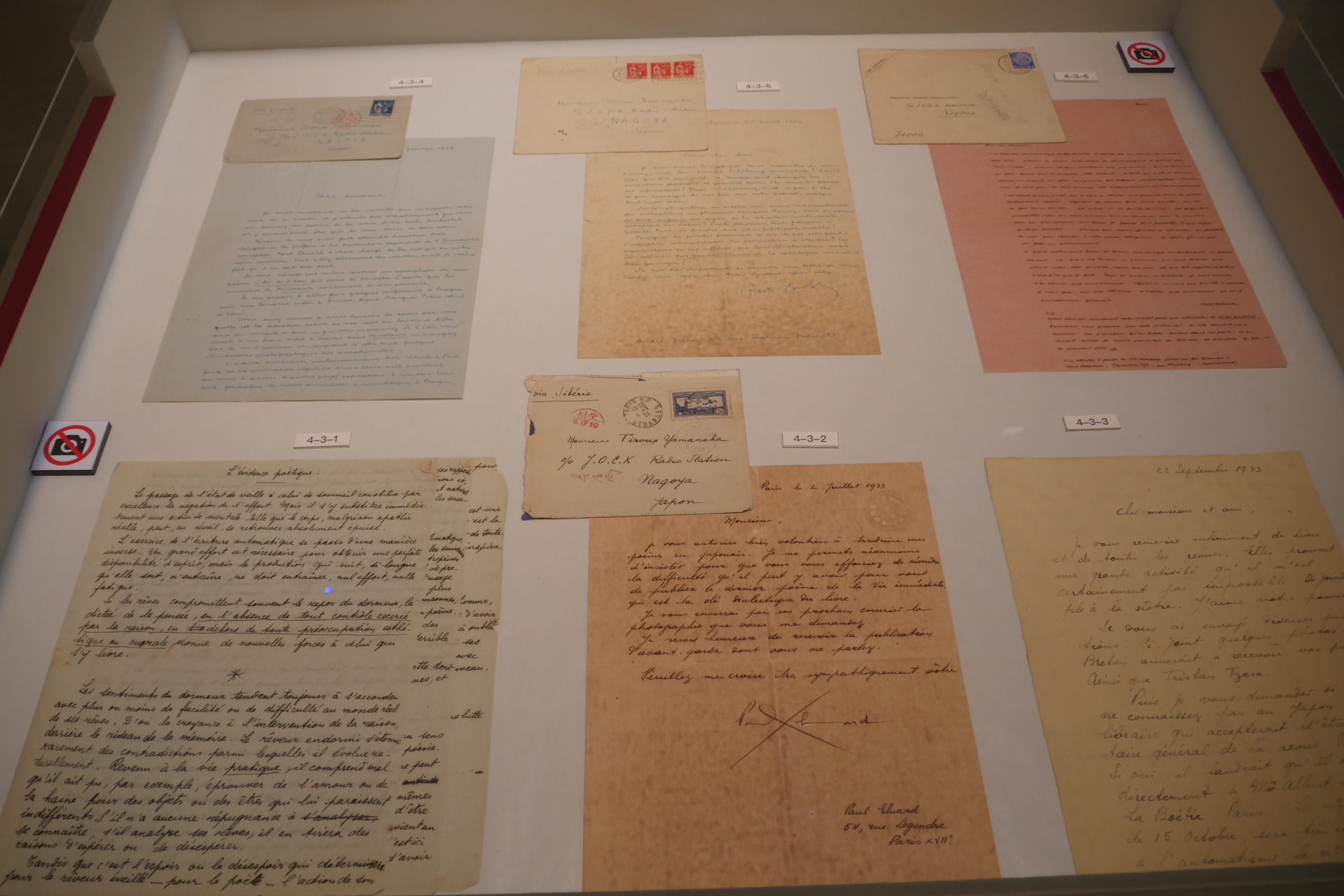 一旁的玻璃櫃所散發出的光芒,吸引你低頭端看當年的書籍、照片、報導、書信、跨國的身分證明、證書、簡報等,尤其是他們對藝術周邊物件的珍藏,讓你一邊欣賞他們所創作出絕大部分的繪畫作品,一邊細細品味關於他們周遭引起的迴響。在一個擺滿西方經典複製畫並展示著達達宣言的空間前方,有著幾封泛黃的法文書信,縱使字跡潦草,仍可仔細辨識寄件人姓名與地址。即便不懂法文,至少有幾個關鍵字可以找出端倪,例如艾呂雅(Paul Eluard)、安德烈‧布列東(André Breton)與漢斯‧貝爾默(Hans Bellmer)等人在書信末的簽名,大概有些與超現實主義有關的拉丁文單字,而這些信件的收件人都是山中散生。這些資料意味著什麼?如果捨棄藝術史中第三人的再詮釋,暫且放下翻譯隔閡不談,如果我們能直接閱讀書信與文件本身,再與牆上的繪畫交互參照,那我們能從這些藝術家直接攝取到的養分會是什麼樣的效應?