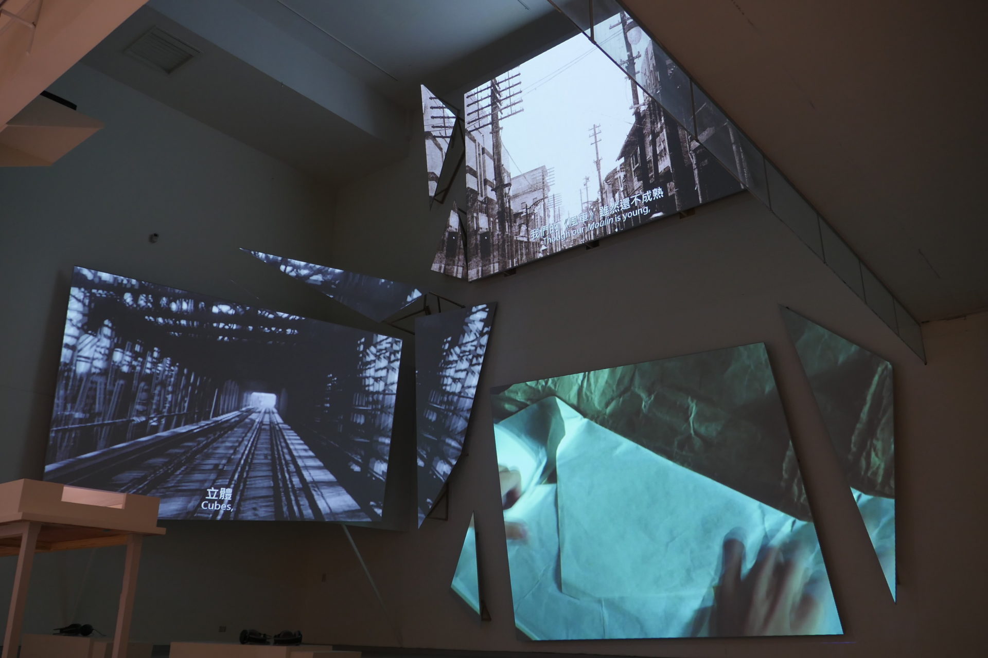 除了在美術館散步所看到的文件與繪畫之外,無法忽視既巨大又特別的碎形化屏幕,幾乎透過影像包圍了現場觀眾。這些影像分為兩大主題,一大部分來自於紀錄片《日曜日式散步者》的片段,另一部分則是從藝術史中的繪畫、攝影與電影史中的紀錄片、實驗片、劇情片等內容擷取之後再重組。影片展現風格讓觀眾顯而易見的感受到與展場的一致性,縱使是紀錄片卻捨棄教條式與詮釋性的內容,以詩意的文字與影像共譜,觀眾就像是走進實驗片的展場之中,各種影像如星星般飛過眼前。