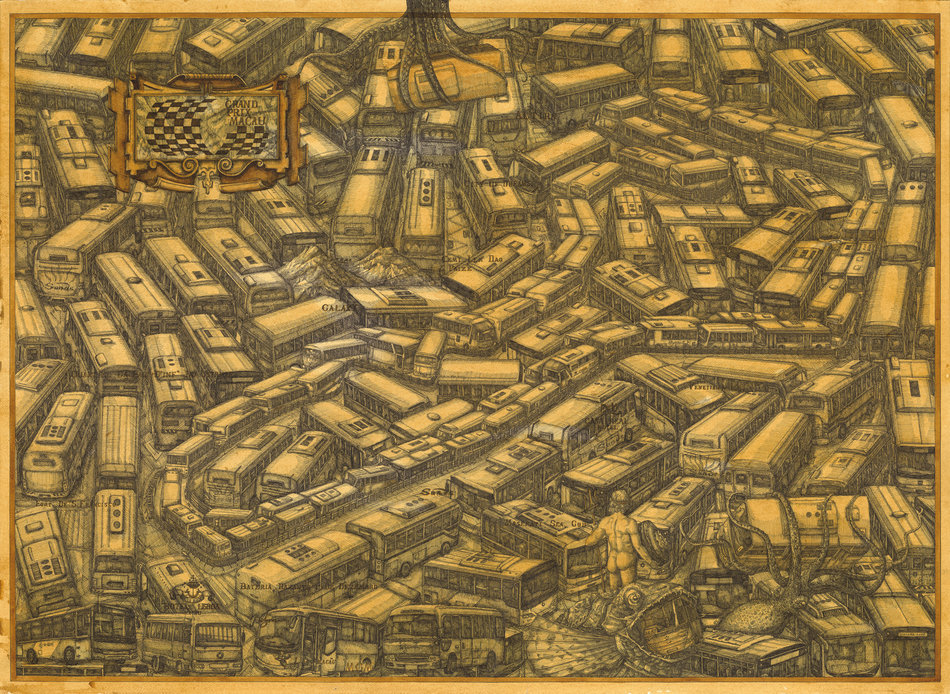 作品〈2047‧16〉(圖4)則滿布密集的發財巴,既荒誕卻又真實的反應澳門現況。畫面的邊緣出現海洋生物,如古地圖中經常出現的海怪和海神波賽冬,面對生活空間遭到不斷壓縮而作出最後的抵抗。