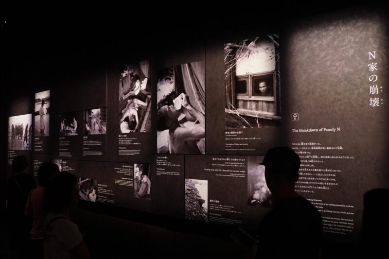 Besides, there is a special display in the fourth section about (anonym) Mr. N. Mr. N was a survivor of the atomic bombing but suffered major burns/ third-degree burns. Afterwards, his life was lingering in between starvation and works. Since if he doesn’t work, he could not raise his family; however, if he kept working, his body had to endure severe pain. When his wife passed away, he planned to take his daughter and suicide together, but he gave up and lived his remaining miserable life. Mr. N died in 1967 with hundreds of scars on his thighs, scratched by razor blades to divert attention from agony. The death of Mr. N was the end of the N family. The final paragraph of description said “The emotions of sorrow, sadness, anxiety and despair haunted every seemingly happy and peaceful moment after the atomic bombing, the pain for these survivors and their family would never ever be eased.” From the collapse of a single family and documentary style linear narratives, this story reflects the situation of the majority after the incident. Nuclear bombing not only caused bleeding wounds visible to naked eyes, but triggered those shatter and breakdown of family and anxiety to unknown diseases, lasting in people’s mind for a long time.