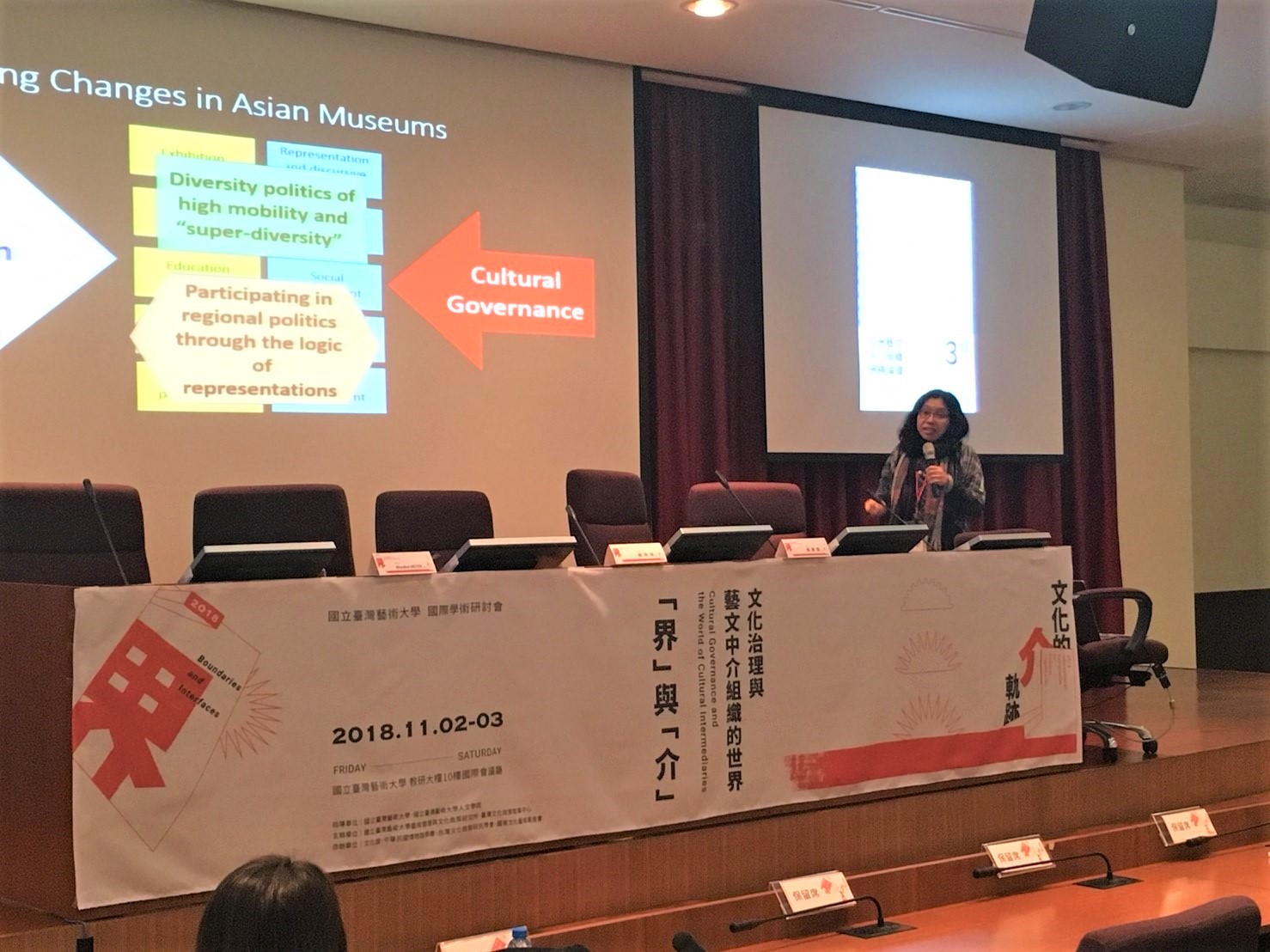 因此,我的簡報以「文化治理」(cultural governance)概念反映亞洲博物館的動態,檢視臺灣、新加坡及泰國的案例。要如何補捉亞洲博物館領域的改變呢?從博物館行政來看,範疇通常包含:展覽、教育活動、專家學者網絡、經濟效益。同時,博物館也有其他類型的參與,如再現與論述的實務與政治參與,後者是因為展覽多取決於地方或中央政府政策、國際動態等,另外還有社會、文化及經濟參與。但現在,我們也看到博物館去處理高度流動(high mobility)及「超級多樣性」(super-diversity)的政策,以及博物館透過再現參與區域政治,而文化治理的概念就可以幫助我們了解這兩個新發展。