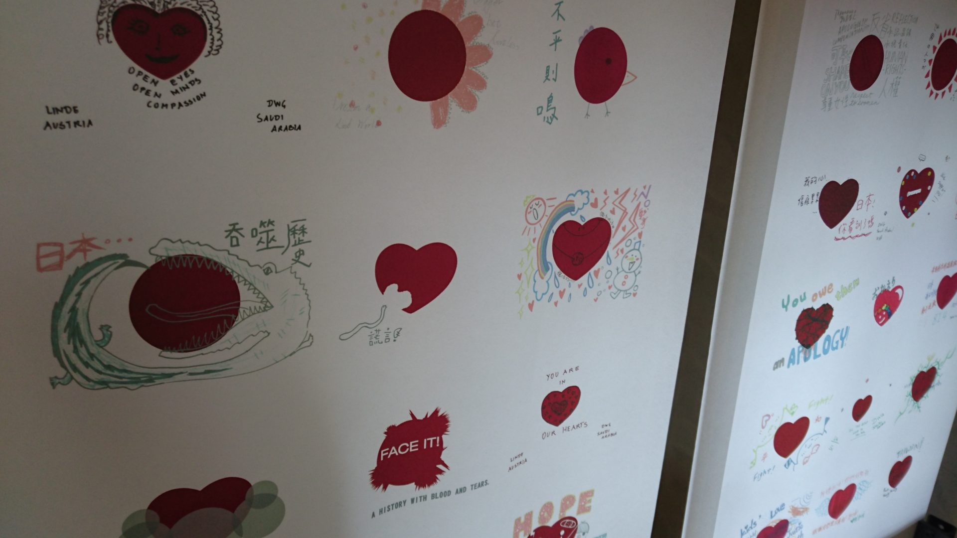 台灣阿嬤家和平與女性人權館,提供創作素材讓觀眾留下觀展心得(田偲妤攝影)