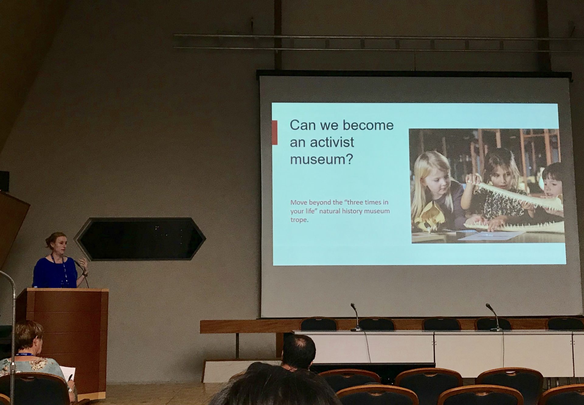 隨著社會變遷,博物館教育的角色與功能漸趨多元。除了傳遞知識外,博物館教育還有哪些可能性?推廣地球永續發展、促進大眾健康福祉、提倡社會正義、推動社會包容與文化平權等議題在會中被大量討論,並有許多博物館分享自身的案例。Juliette Fritsch博士介紹丹麥自然史博物館在籌建新館的過程中,重新思考自然史館是否能作為「行動派的博物館」(Activist Museum),針對不平等、不正義、環境危機等問題有所作為,甚至推動社會運動。為促進地球永續,他們以身作則,不販售∕提供一次性塑膠產品、在所有活動僅供應素食餐點、計算碳足跡並制定補償方案。「言行一致」(Practice what you preach)是他們的信念,透過實際行動,教育大眾關心社會議題。