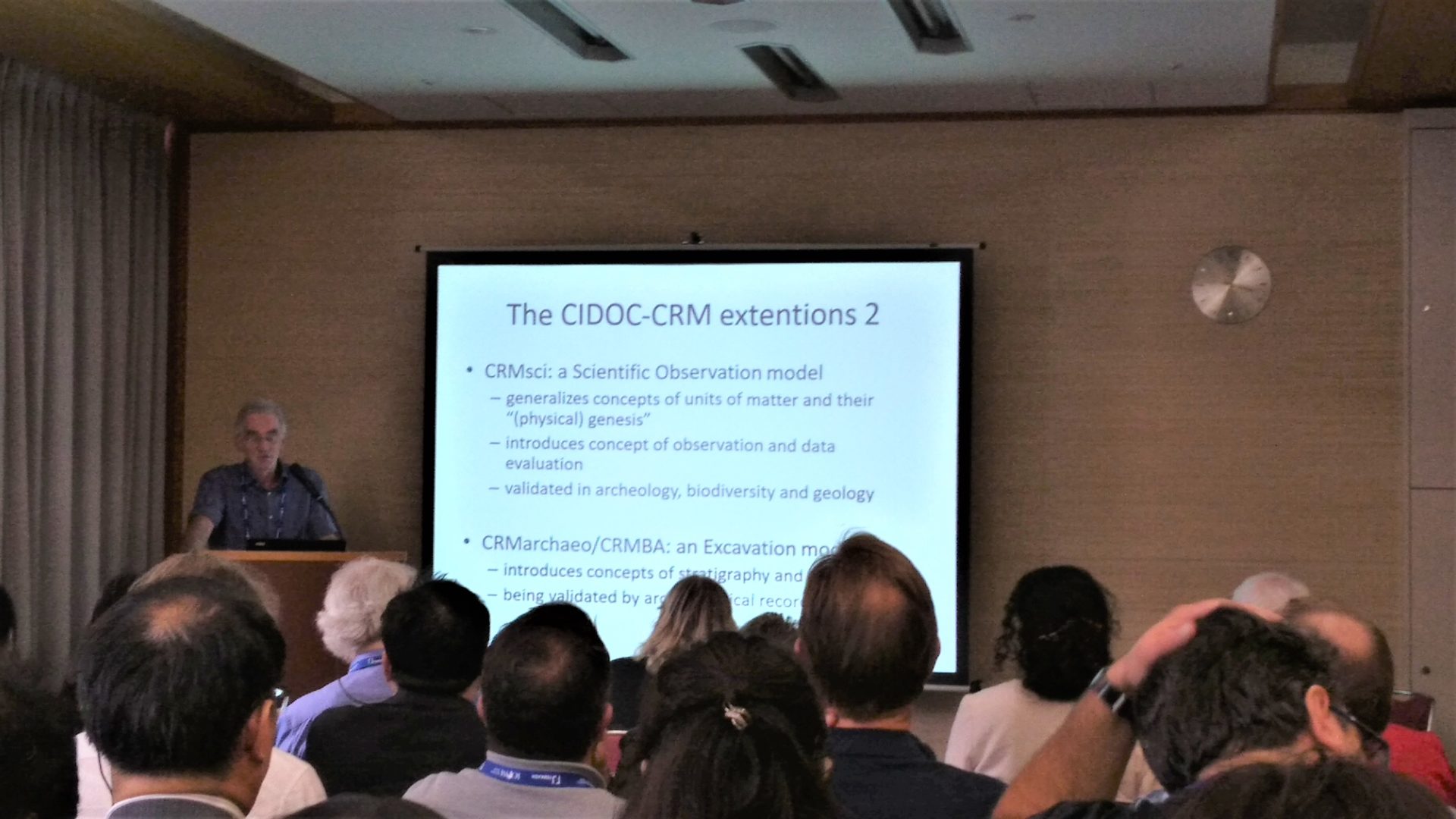 筆者本次參與CIDOC工作報告會議和主席Monika Hagedorn-Saupe教授進行交流,同時,該委員會的CRM專業工作小組Christian-Emil Ore副主席於會議上說明次階段的CRM擴展模組規劃。CRM在基礎資料的呈現經由事件、物件、發生∕呈現地點及參與人物等資訊所組成,注重簡要概念(few concepts)與資訊完整(high recall)。至於相關聯的專門領域,則力求專業觀念(special concepts)與高準確性(high precision)的表現,包括:國際圖書館協會聯合會(IFLA)的圖書館文獻資料模型(FRBRoo)、期刊文獻資料模型(PRESSoo)、知識檢證模型(CRMInf)、科學觀察資訊模型(CRMsci)、考古挖掘資訊模型(CRMarchaeo)、數位化資訊模型,以及時空資訊模型(CRMgeo)。