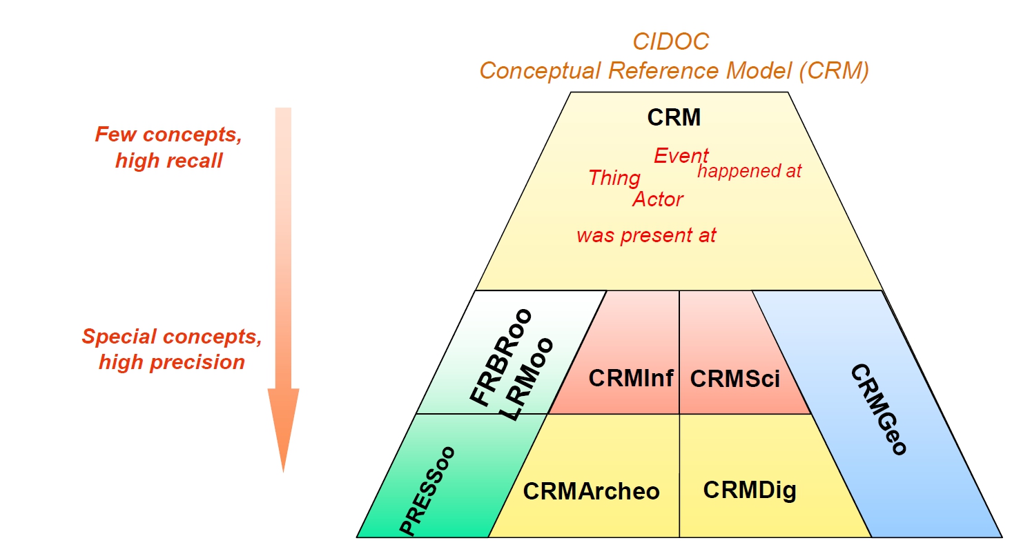 為此,國際博物館協會(International Council of Museums;簡稱ICOM)於1998年委託其國際檔案委員會(International Committee for Documentation;簡稱CIDOC),發展出文化資產領域專屬的「概念參考模型」(Conceptual Reference Model;簡稱CRM),是以文化資產知識為素材,運用資訊科學的本體論原理而編寫出來的資訊架構集合。