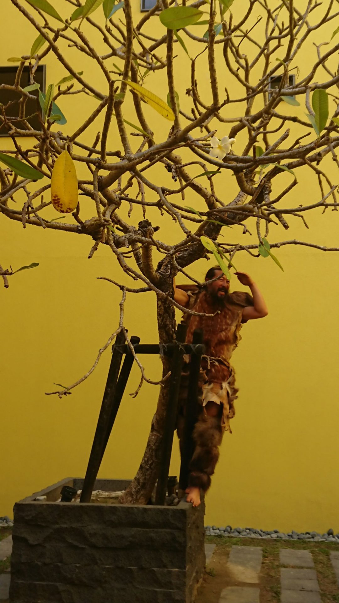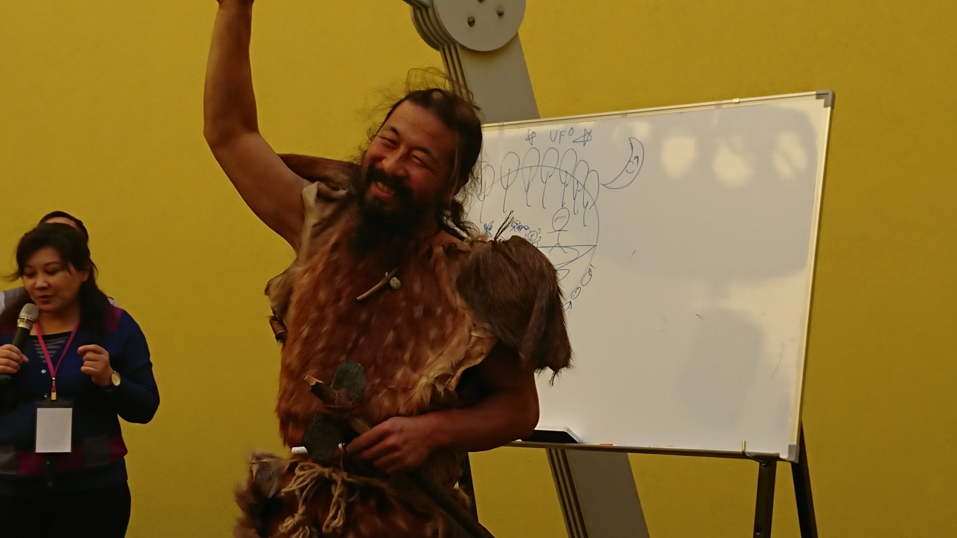 當雨宮老師一現身,你馬上就知道這不是一場普通的展演。老師身穿鹿皮、羊皮製成的獸皮衣,獸皮來自遭路殺的動物,一副活生生舊石器繩紋人模樣,而他也真的在富士山腳下過著原始的生活。只見老師身手矯健地攀上樹,對著樹下圍觀的小朋友大喊:「我要下去囉!但你們不要把我吃掉!」接著他從地上撿起一顆石頭、一根樹枝,在地上大力敲擊:「對你們來說最重要的是什麼?」「對原始人來說,最重要的是生命!」