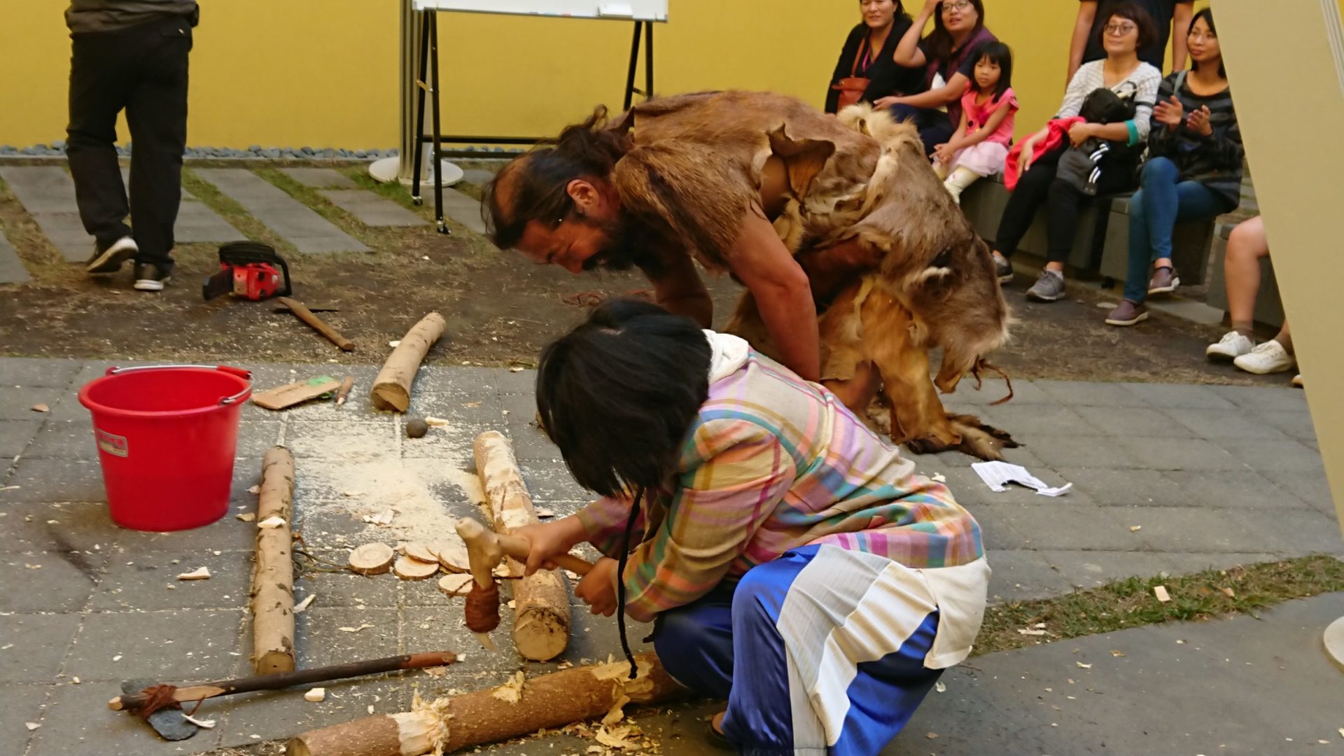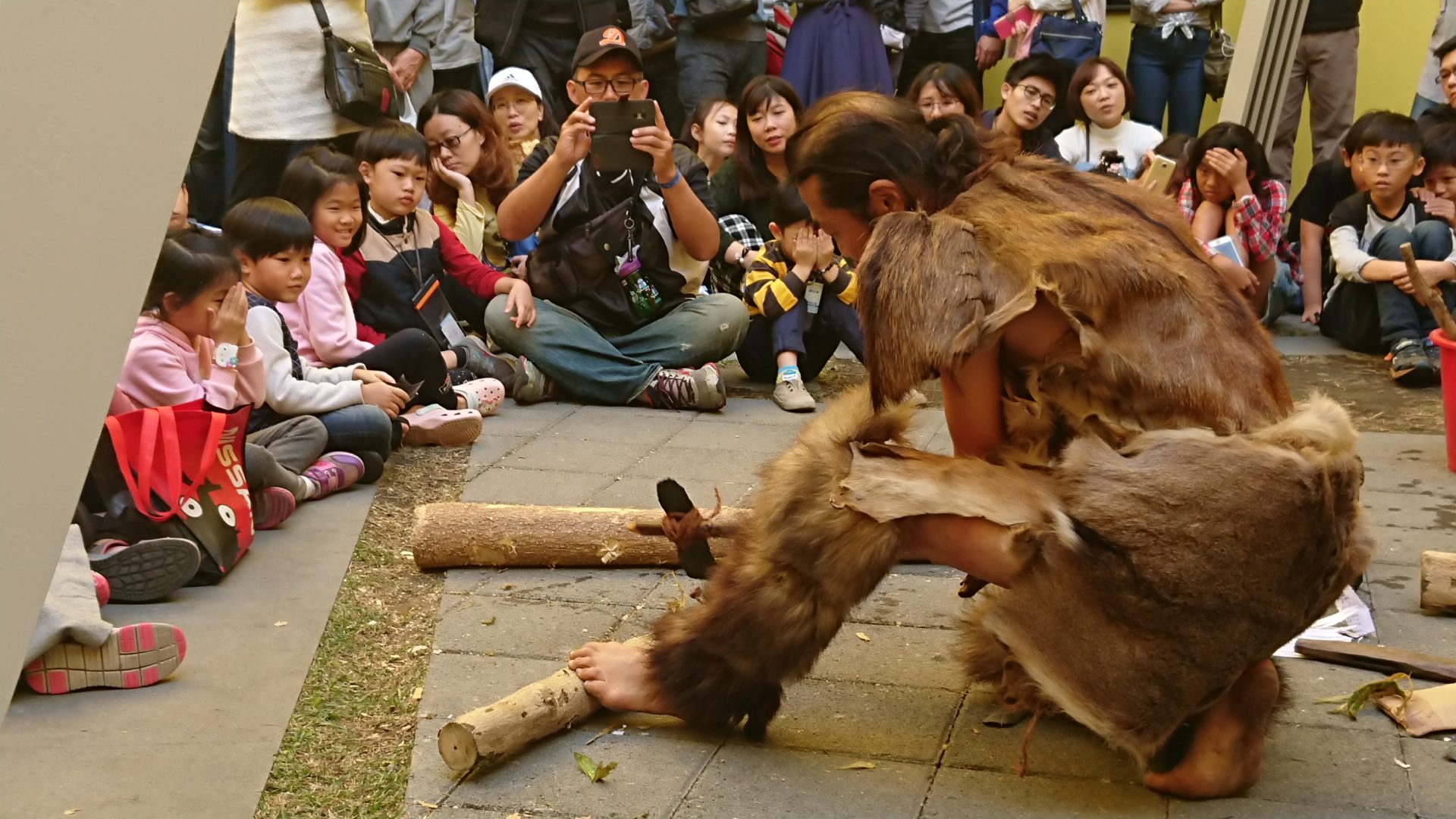 如果我們可以將工具用在好的地方,放慢我們汲汲營營的生活態度呢?雨宮老師在白板上畫出心目中美好的地球,一處自然萬物共生共存的美好天地。一個小時的展演過程中,雨宮老師身體力行地示範史前人類的行為、石器的製作與使用,並積極地與觀眾互動,藉由觸摸石器、嗅聞獸皮的氣味、石器砍伐木頭時飛濺的木屑與巨大的聲響,這些刺激感官的體驗,再搭配館內的展覽,加深了觀眾對史前文化的認識。