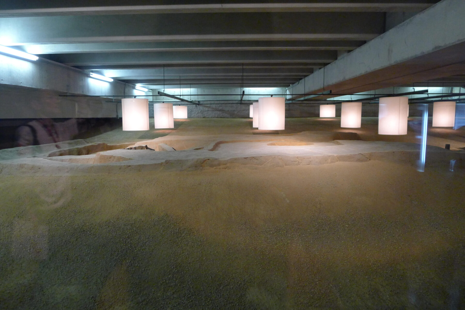 大阪歷史博物館B1保存的前期難波宮遺跡(以燈籠表示柱洞所在)