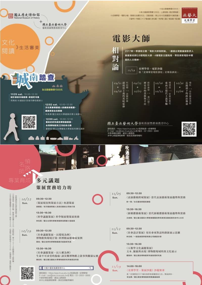 「多元議題策展實務培力坊」:內容包含策展現況與策展方法、科學議題策展、社會議題策展-以環境為例、社會議題策展-以人權為例、表演藝術跨域策展、新媒體藝術策展、社會設計策展、人類學文化議題策展、史博學堂-策展沙龍