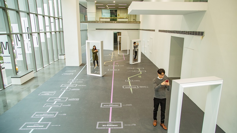 《日本近代洋畫大展》與工業技術研究院跨界合作,將「可見光通訊」和AR擴增實境技術應用於導覽,並以「任意門」作為虛實共構的意象 。