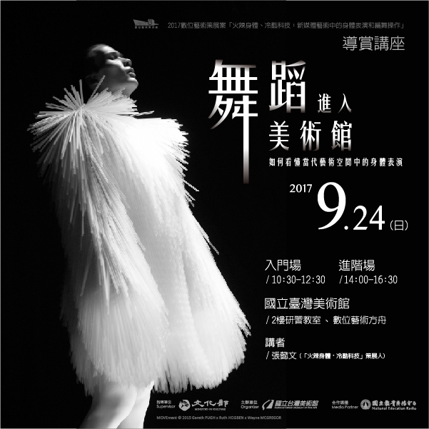 「火辣身體、冷酷科技:新媒體藝術中的身體表演與編舞操作」展覽關注身體展演性和編舞操作在新媒體時代的體現,本講座將由策展人張懿文,以深入淺出的方式,介紹芭蕾、現代、到後現代舞蹈的歷史脈絡與美學特質,當代舞蹈的不同流派,和後現代舞蹈與美術館之間的淵源,分享講者在歐洲不同當代藝術空間(如威尼斯雙年展、法國龐畢度藝術中心等)觀看表演(Live Arts)的心得,並進一步引領觀眾至「火辣身體、冷酷科技:新媒體藝術中的身體表演和編舞操作」展覽進行現場導賞,打通觀者對舞蹈認識的任督⼆脈,讓您從此不再看舞看到睡著,終於可以看懂在美術館中的身體表演。