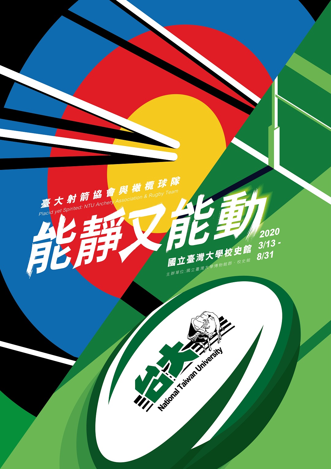 國立臺灣大學居臺灣研究型大學的龍頭地位,未設體育學院,校內僅有「運動設施與健康管理碩士學位學程」專注體育相關人才培育,多年來普遍給人書呆子的印象;然而臺大仍有幾項體育活動在國內體育史上有特殊的地位。今年適逢鄰國日本舉辦2020東京奧運,臺大博物館群、校史館策畫「能靜又能動:臺大射箭協會與橄欖球隊」特展,介紹校史上深具特色的射箭協會以及橄欖球隊,也藉此推展校園內體育活動以及探究校史。射箭是臺灣在奧運奪牌的重點項目之一,而臺大可說是國內射箭活動的啟蒙地;橄欖球則是睽違92年之後在2016年再次以7人制比賽重返奧運,臺灣大學最悠久的球隊就是橄欖球隊。本展覽主要介紹臺大射箭協會以及橄欖球隊歷史與成就。