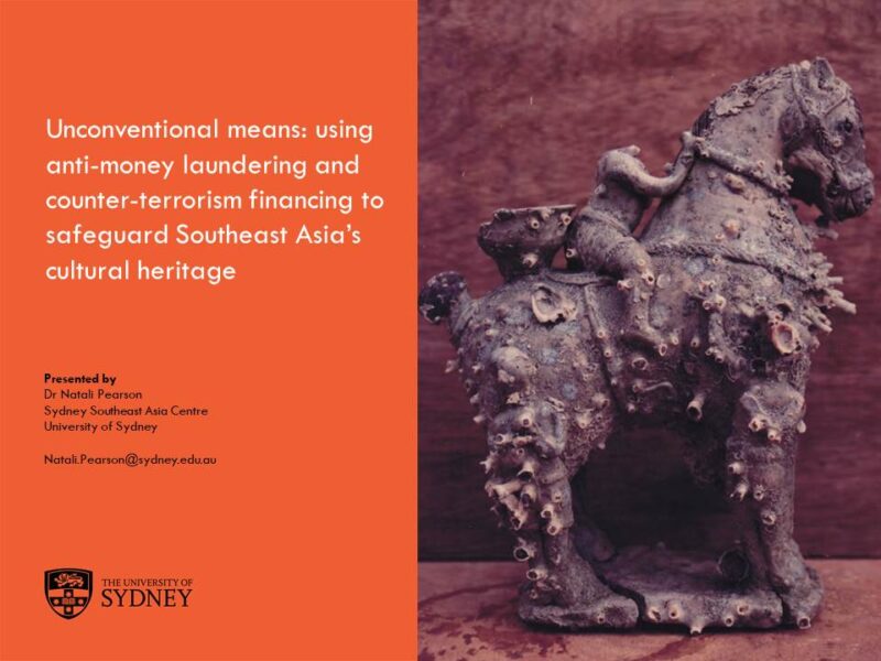 - Pearson, N. (2019, June). Unconventional means: Using anti-money laundering and counter-terrorism financing to safeguard Southeast Asia’s cultural heritage. Paper presented at the 3rd SEAMEO SPAFA International Conference on Southeast Asian Archaeology, Bangkok.