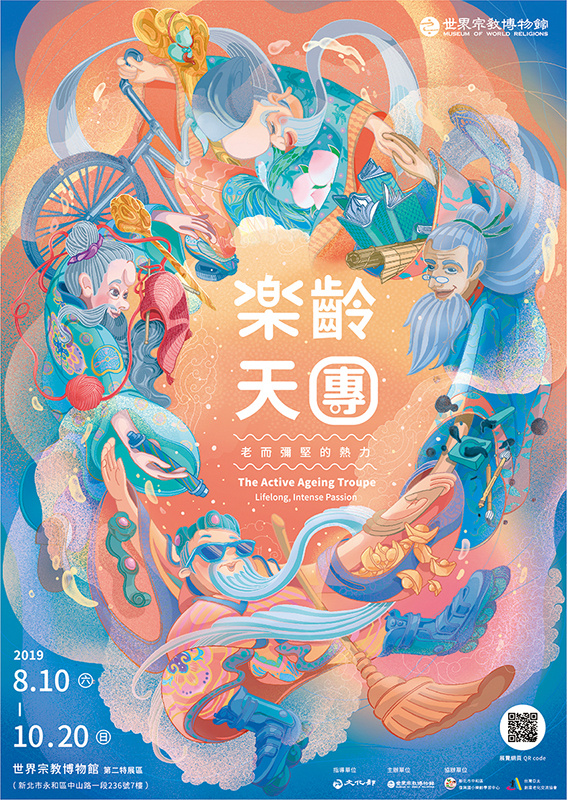 「樂齡」所表達的是快樂學習而忘齡的人生態度,在世界各國逐漸邁入超高齡社會的今日,如何維持身心健康達到活躍老化,已成為不可忽視的議題,因此世界宗教博物館的「樂齡天團-老而彌堅的熱力」特展,透過四位樂齡神明的角色,闡述老年生活依然可以健康愉悅地散發活力與熱情,以開啟觀眾對於老年的多彩想像。