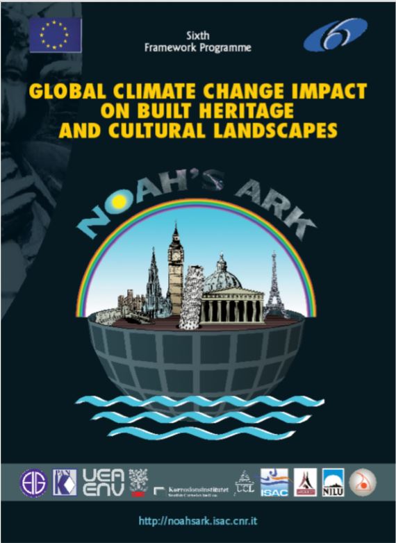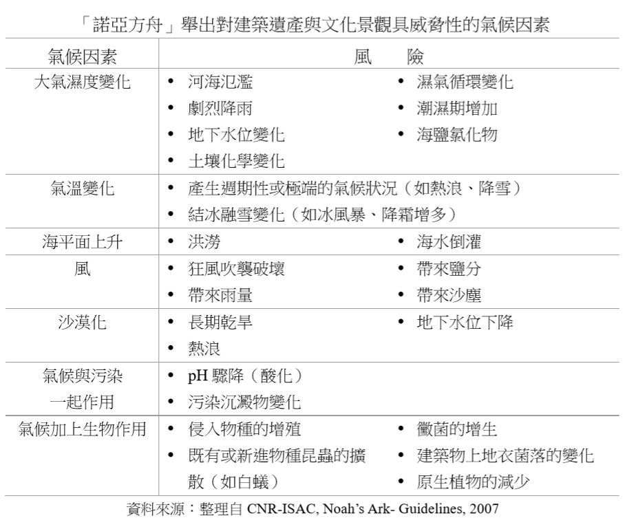 歐洲國家早已意識到氣候變遷對文化遺產的影響,因此在2004年便由義大利國家研究委員會大氣科學與氣象研究所(ISAC)領頭,聯合7國10個機構成立「諾亞方舟-全球氣候變遷對建築遺產與文化景觀之衝擊」(Noah’s Ark – Global Climate Change Impact on Built Heritage and Cultural Landscapes)計畫,2007年計畫完成階段任務,提出研究成果包括:推估了對建築遺產與文化景觀有威脅的主要氣候變化因素(請參考下表)、氣候變遷對文化遺產造成的災損預估,建議探尋緩和與適應災害的對策,以適用於古蹟、遺址及其構成材料,尤其是木材、金屬及磚石材料等,之後集結成《氣候變遷對歐洲文化遺產之影響地圖集:科學分析與管理策略》(The Atlas of Climate Change Impact on European Cultural Heritage: Scientific Analysis and Management Strategies),藉由諸多主題地圖,標示未來氣候變遷對歐洲文化遺產影響的可能程度,籲請歐盟各國持續關注5項主題並採取行動:(1)了解材料、物件的脆弱性;(2)監測變化;(3)形塑與推斷氣候作用(climate behaviour);(4)管理文化遺產;(5)避免損害。