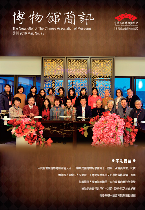 博物館簡訊第75期:年度盛會見證博物館溫情交流-「中華民國博物館學會第十三屆第一次會員大會」紀實 105年3月 On 二月 1, 2017 ◆ 本期要目 ◆ 年度盛會見證博物館溫情交流-「中華民國博物館學會第十三屆第一次會員大會」紀實 博物館人腦中的人文地貌─「博物館聚落與文化景觀國際論壇」寄語 推廣國際人權博物館聯盟─來自臺灣的實踐與發聲 博物館教育與近用性─2015 ICOM-CECA年會紀實 有愛無礙—故宮南院無障礙規劃 Share